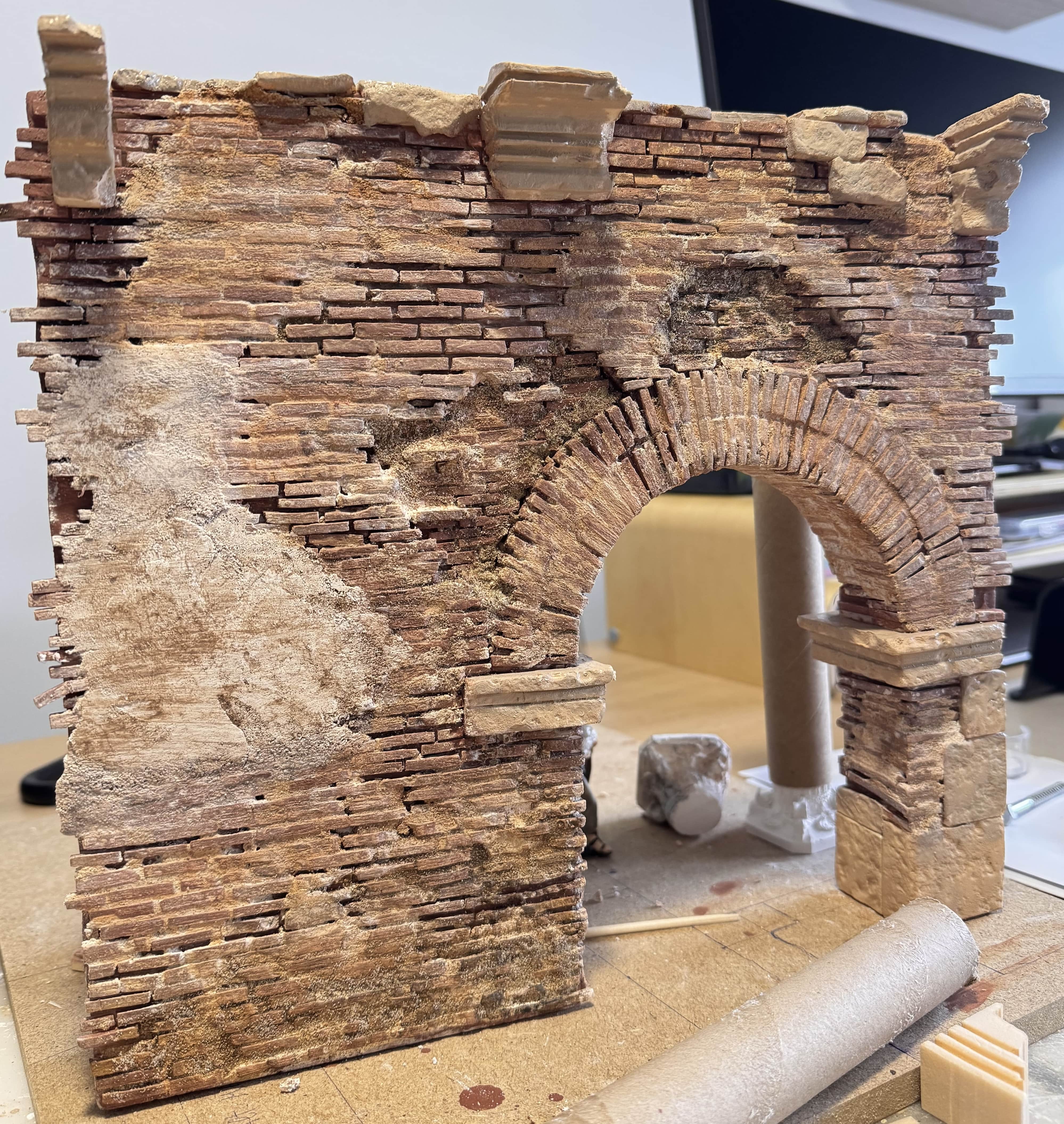 La estructura principal que os muestro aquí es el pórtico de ladrillo con un arco de medio punto ambientado en el pórtico de Octavio de Roma. Con algunas dovelas y cornisas en mármol, las cuales aún no están terminadas. El trabajo del ladrillo y el mortero, así como la pigmentación de ambos sí que lo doy por finalizado.