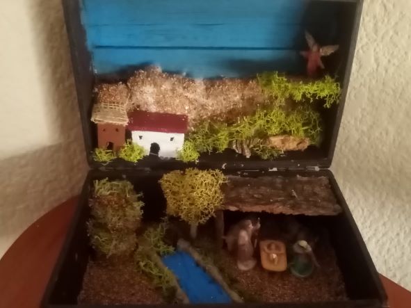 Materiales: madera, musgo neofilizado, corcho en viruta, porexpan, y sistema de luz a pilas.