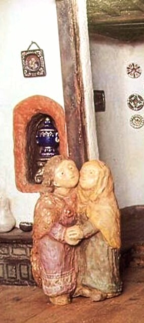 Tres figuras femeninas y un niño, se disponen simétricamente, una de pie y dos sentadas, con el aire de un ritual que se repite cada día. El conjunto escultórico, de pequeño formato, se agranda, en la sensibilidad del que lo contempla, robustecido por la ternura que imanan las figuras que, con un expresivo silencio, transmiten un cálido sentimiento de respeto hacia los modos de vida de las gentes sencillas del pueblo. El contorno suave de los rostros, contrasta con los surcos y asperezas de los vestidos, con un lenguaje propio, de gran atractivo.