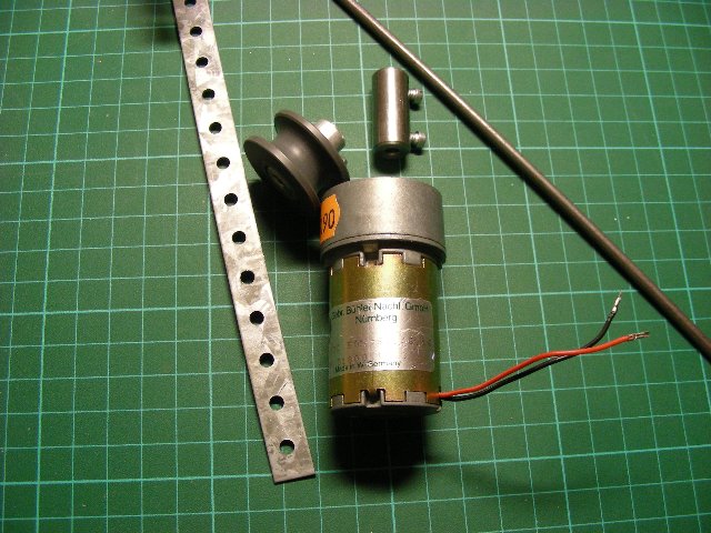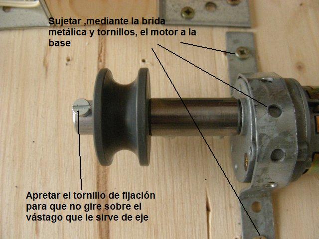 Con una brida metálica, que hemos adaptado a la forma o contorno del motor, lo fijamos a la base, teniendo presente que la polea coincida con la vertical de la columna, con el fin de que al girar el motor el cordón de tracción se líe sobre la polea y no sobre el eje (os aconsejo hacer algunas prueba, antes de fijarla definitivamente) (Foto 27).