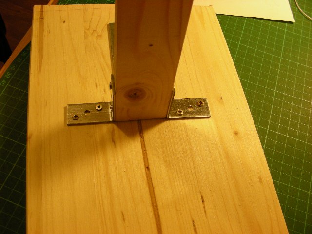 Sobre esta base se va a chocar la columna que servirá de guía al patinete. Sobre esta base fijamos la columna de madera de 4’5 cm x 2 cm; 80 cm de largo, que previamente hemos cortado, mediante tres escuadras. (Las dimensiones que aquí pongo son para figura de 11 o 12 cm, para otras medidas habrá que calcular las alturas de: el ángel, la escuadra donde ira el patinete y altura de escuadra de la fijación a la base )