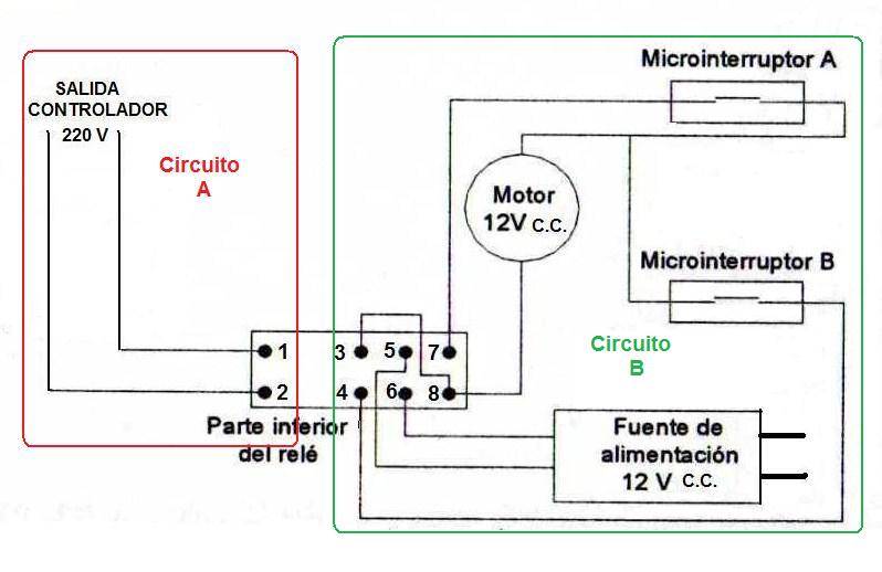 El circuito A: que procede del controlador (generalmente a 220 v) y que va a ser el responsable de que paseo no la corriente a la bobina del relé y como consecuencia cierre el circuito de una forma o de otra.