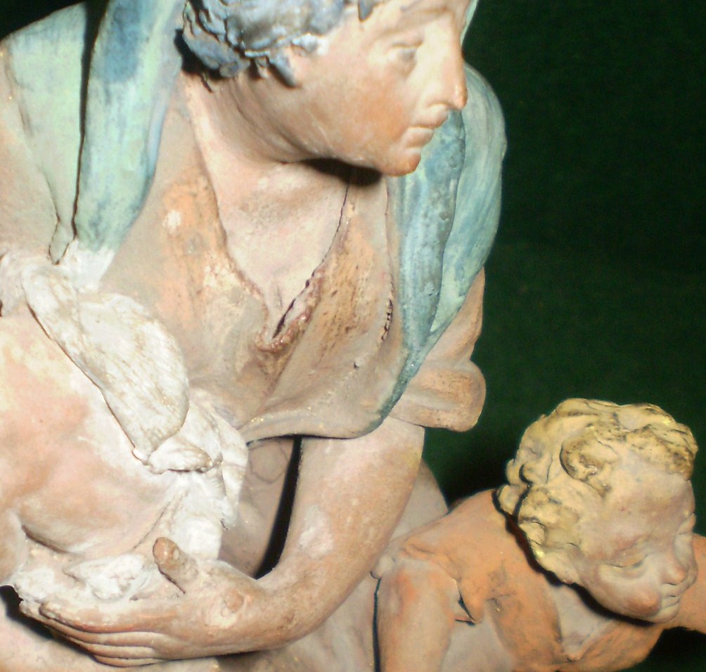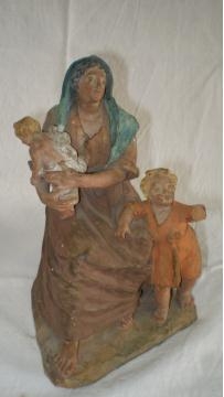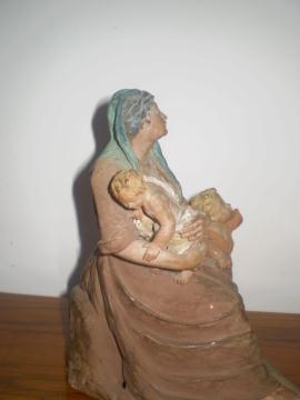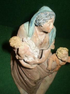 Otra cosa es la figura de la mujer con los dos niños, que es bonita, interesante y misteriosa. Podría pertenecer a una matanza de inocentes (me lo ha indicado Sereno), una Virgen María con Jesús y el Bautista (demasiado mayor el niño grande) o no ser de pesebre, sino solamente decorativa, o el boceto de una figura mayor (no parece completa, sino esbozada) Por un momento he pensado en Campeny, pero repasando las fotos que hay en el libro "El pessebre a Mataró" no se parece en nada... realmente me gustaría verla sin la capa de porquería que llevan encima.