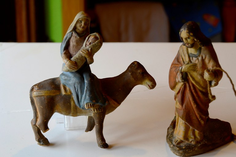 La de la huida de Egipto es de barro y miden 12cm, a su parecer estaban unidas por la peana, ya que ahora esta rota.