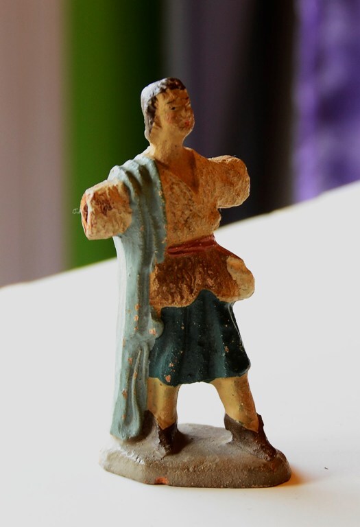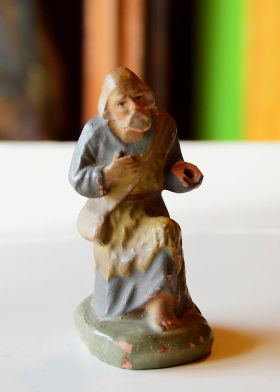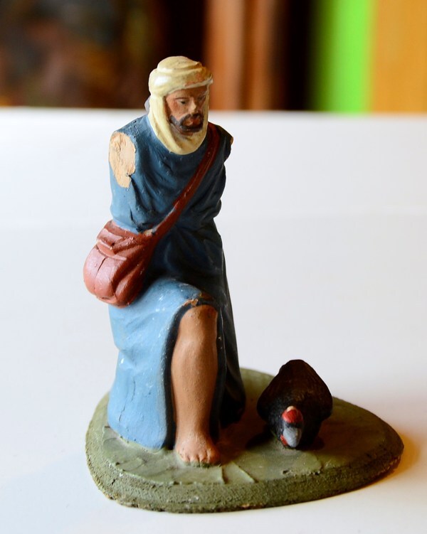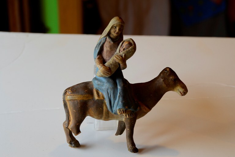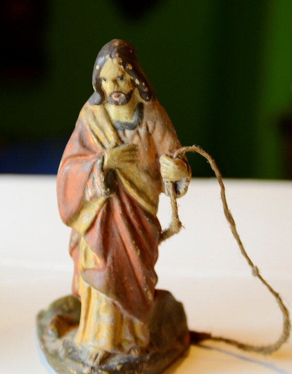 Amigo Riera, la única identificable es el Manelic, que podría ser de Aurora, antes tenía alguno, pero no recuerdo dónde lo tengo. Ha de poner los brazos en alto para llevar el bastón. La última de yeso rosa es una copia de una figura muy habitual que fueron copiando todos los figuraires de Santa Llúcia, podría ser del famoso ACEH-1, o algo así le llamé yo. El resto son populares anónimas, que no podremos identificar jamás, ni siquiera tengo muy claro que el San José de la huída sea el orginal, da que se han juntado figuras de dos procedencias diferentes. Por favor, no toques la Virgen en el burro, que está perfecta como está, aunque el burro esté muy cojito, y es una pequeña joya de arte popular.