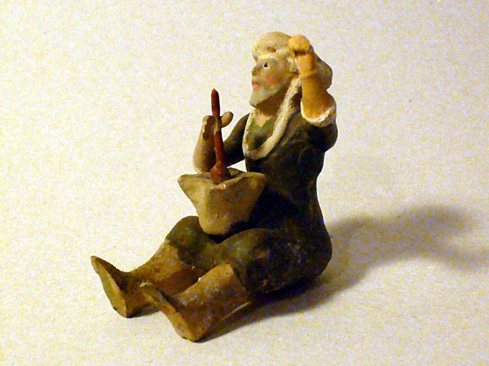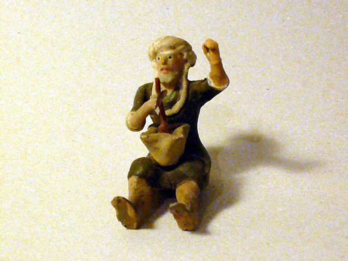 Es un pseudoteixidor, quizás auténtico, quizás copia (parece un poco burdo para 10 cm). Las atribuciones a Teixidor en este tamaño van desde piezas muy finas hasta otras bastante sencillas, como ésta. Pese a quien sea el autor, la figura tiene mucha gracia, con ese mortero de allioli, y seguro que es muy antigua.