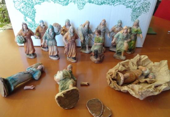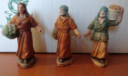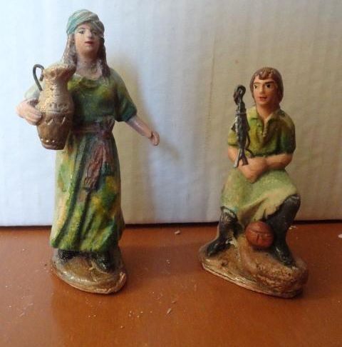 Son de barro. La base de madera la ponían también en Murcia, Ortigas entre otros,...son murcianas, entre otras cosas lo denotan esas "manoplas". Son lo que llamaban granadinas, generalmente copias modificadas de figuras catalanas y granadinas, de los años 40-60. Mira el hilo de Ortigas