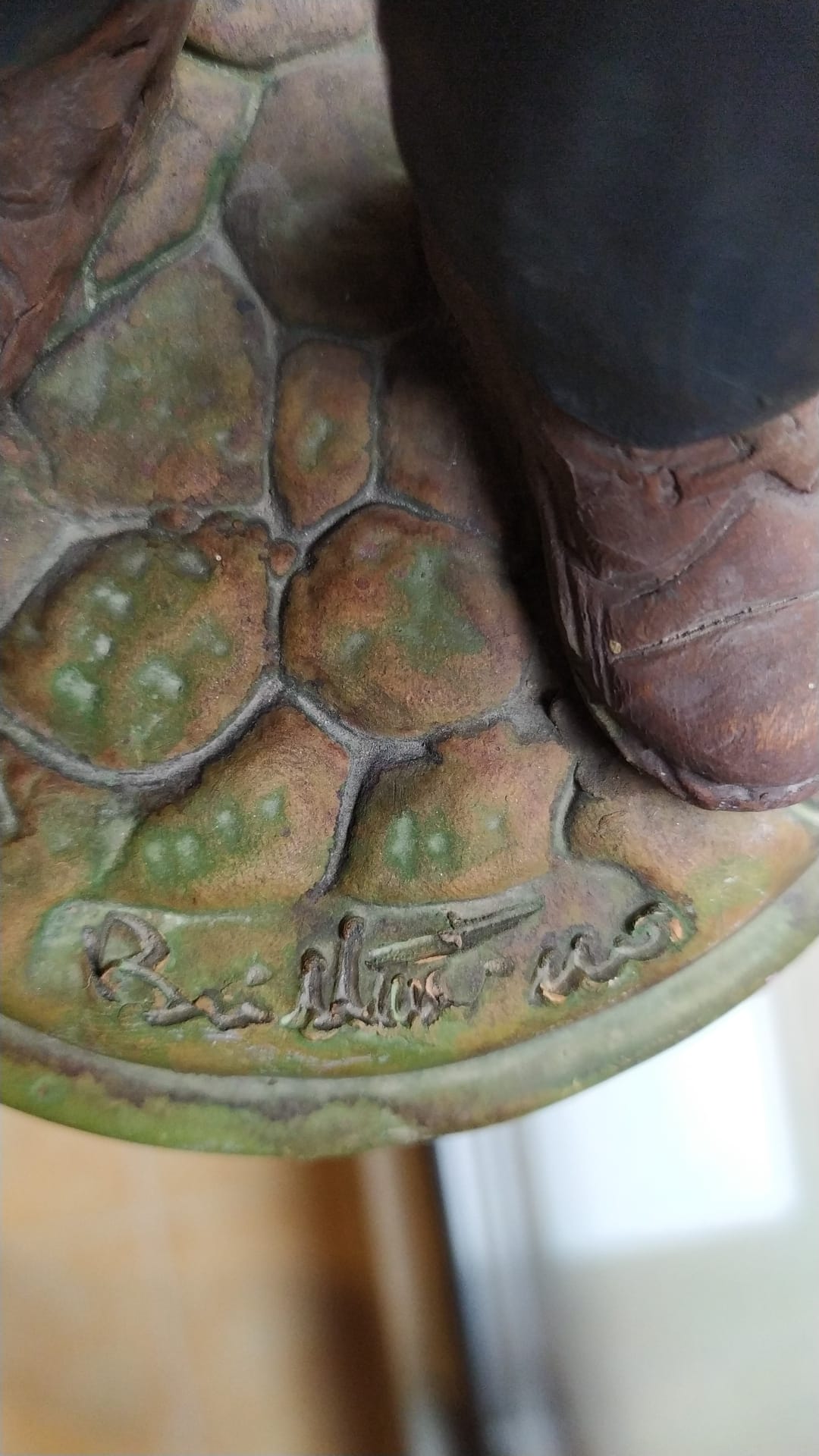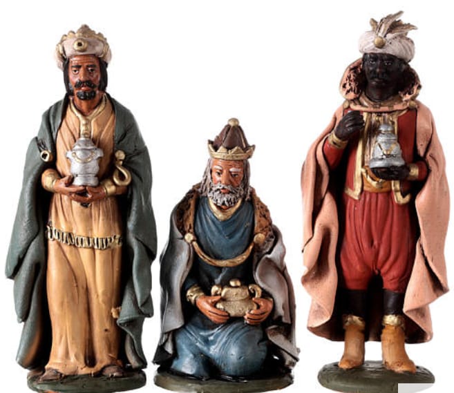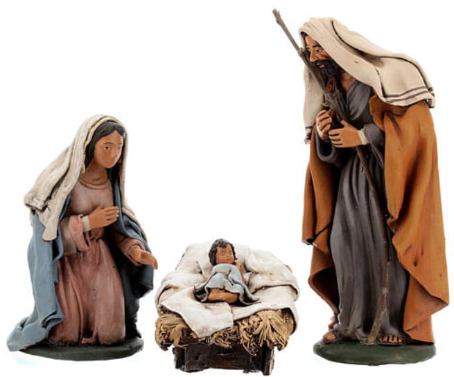 Encontré unas figuras ciertamente parecidas en la red en Holyart, son más pequeñas estas son de 18cms., hechas en Italia(parece que no hay firma), parte del texto puede ser una pista:..."Figura para el pesebre hecha de arcilla y pintada a mano. La figura está hecha y pintada a mano por los artesanos locales, con arcilla cocida y pintura acrílica.