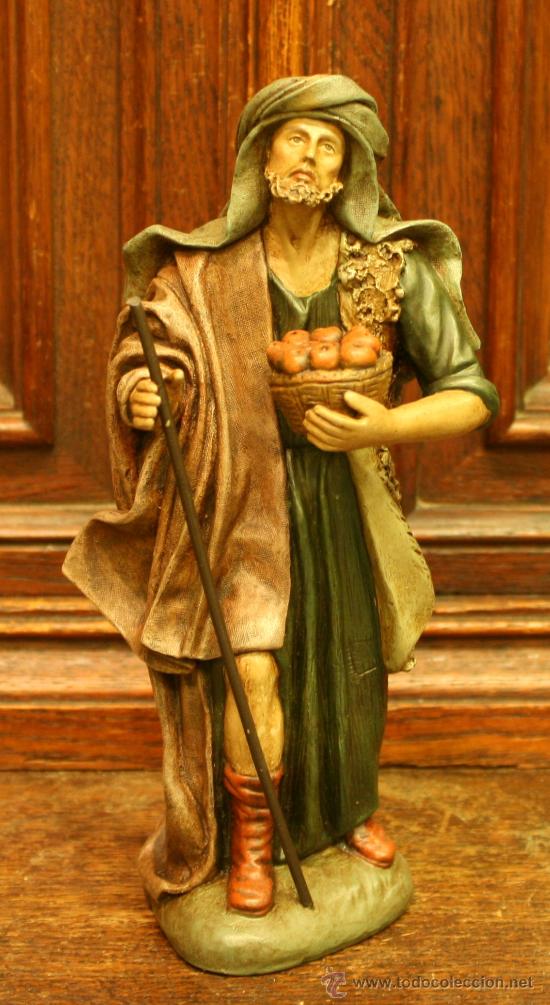 Si que me sonaban las figuras, de hecho, tengo el pastor con el cesto de fruta y el baston en 12cm, pero de marmolina. Creo que los hace Maestros Artesanos, o al menos vienen en su catálogo, pero no en las figuras de barro lienzado sino en las de marmolina, (pongo una foto y un enlace al catálogo donde la he encontrado http://www.maestrosartesanos.com/Figurasdemarmolina.htm ). Lo que me despista es que parece que tienen una pátina y el aspecto es igual al que da la pátina de cera con betún de judea.