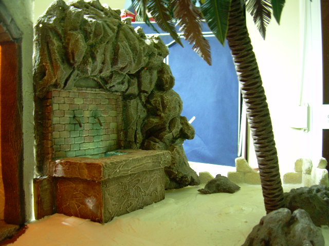 Aqui os muestro  mas avanzado mi belen, acabo de darle escayola al suelo y como podeis ver he hecho una palmera que aun le quedan por poner los datiles, y la fuente esta terminada.