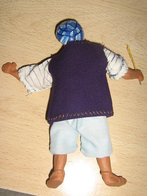 Anoche anduve de costurera jejeje (de las malas eso sí)y en un ratito le preparé esto, es una prueba,pongo las fotos para que me deis vuestra opinión,la verdad es que al pobre turco le tengo que dar algo más de comer que le tengo muy flaquito jajaja pero era para que os hagáis una idea.Jesús,se que me dijiste que el chaleco en otro color, pero esta tela era la que tenía a mano, no creo que quede mal,ahora, lo de los pantalones....no lo veo jajjaja le hice una foto con la camisola sóla para que veas como le queda,creo que sería una buena opción el dejarle con una camisola hasta la media caña de la pantorrilla y el chaleco o una túnica hasta abajo de los piés,os pongo las fotos y espero vuestras opiniones.