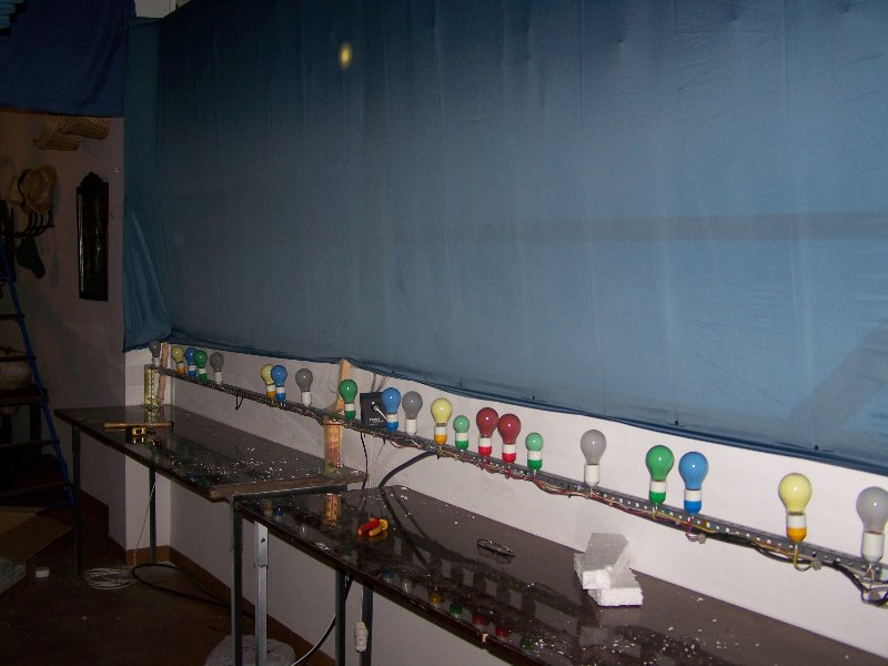 La mesa tiene 4 mt de frente por 2,10 mt de fondo, la tela va sobre un marco de madera en el marco va incrustado el porex y colgado de cuatro alcayatas, pero como el año pasado me costo mucho trabajo poner la fibra, a esa masa que ves en la foto de arriba, le e hecho un armazon donde pondre el marco, para que no balla en la pared, asi que retiro la mesa, pincho la fibra y la vuelvo a arrimar a la pared, a!! la mesa que tienes mas arriba tiene 65cm de ancho, las otras mesas van despues. Mi Belén es visto a tres caras o abierto, y lo de poner la fibra ya te lo dije, vas pinchando hilo por hilo en el porex, yo empieza por los mas cortos y acabo por los largo evidentemente. Si sigues con dudas ya sabes