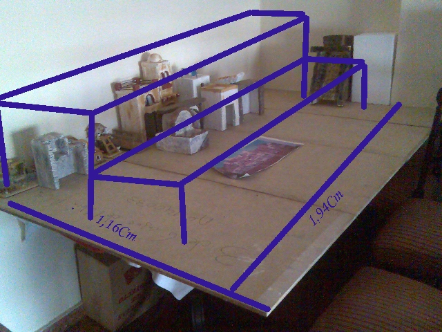 Hola a todos los amigos y maestros belenistas. Me gustaría plantearos una pregunta sobre el montaje que quiero hacer para este año. La idea es de montar el belén en varias alturas y me gustaría que me aconsejaraís a que altura debería poner los escalones. Os envió una foto para que veaís las medidas de las que dispongo.
