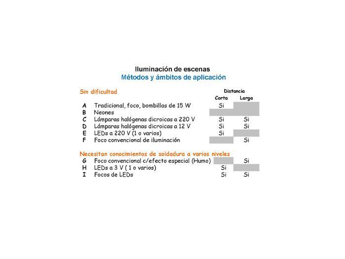 Porque Geni no habla de iluminación de belenes (grandes o pequeños) o de dioramas, sino que habla de iluminación de escenas y aunque, naturalmente, varían las lámparas según el tamaño de la obra o más bien, según la distancia que dispongamos y que además, también varía según el nivel de preparación del usuario, es por lo que puso un último esquema según las últimas novedades que se han ido incorporando al mercado (gráfico titulado iluminación) y así, para un diorama, puedes aplicar las que se describen "sin dificultad" y "para distancias cortas".