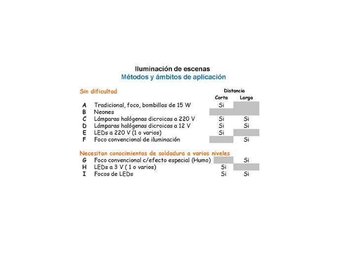 Porque Geni no habla de iluminación de belenes (grandes o pequeños) o de dioramas, sino que habla de iluminación de escenas y aunque, naturalmente, varían las lámparas según el tamaño de la obra o más bien, según la distancia que dispongamos y que además, también varía según el nivel de preparación del usuario, es por lo que puso un último esquema según las últimas novedades que se han ido incorporando al mercado (gráfico titulado iluminación) y así, para un diorama, puedes aplicar las que se describen "sin dificultad" y "para distancias cortas".