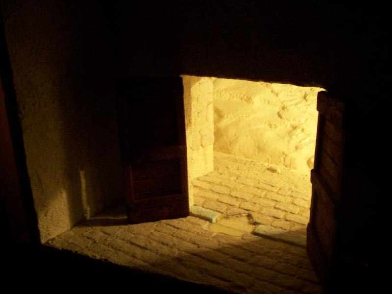 La zona de la estancia la iluminaría con una única bombilla de 5w, situada en la parte alta de la embocadura que, junto con la luz que entrara por la parte posterior de la estancia (la luz del día del paisaje), sería suficiente para iluminar discretamente dicha estancia con dos fines: uno, para dar intimidad a la escena (en mi opinión una de las escenas más íntimas posibles) y dos, para que resalte la iluminación de lo principal ( por medio de leds: 2 cañones por el método de Emilio, dichos cañones formados por tres leds cada uno, siendo uno de ellos ( el de haz más abierto: enfocado hacia la Virgen desde lo alto, con ligera angulación y oculto tras una viga, por ejemplo, del techo, y el otro, el más puntual, dirigido hacia la cara del ángel pero, en este caso, de abajo hacia arriba es decir, empotrado en el suelo y oculto al espectador con algún elemento propio de la estancia (jarrón, banqueta, cesto de costura, etc). Y terminamos la iluminación de la estancia con la tenue luz que provenga de algún farolillo o antorcha así como de unas posibles brasas.