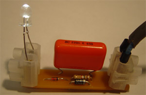 - El cable de salida podría soldarse directamente a las patillas del LED, pero como la distancia puede ser mayor y se trata de tener un conjunto desmontable, se acostumbra a intercalar un conector macho-hembra, que finalmente va soldado al LED en su otro extremo. En la foto se aprecia el conector desenchufado que por su lado izquierdo, con cable negro, va hacia el alimentador y por el otro, con cable negro-rojo, va al LED, que no se ve en la foto