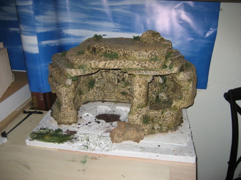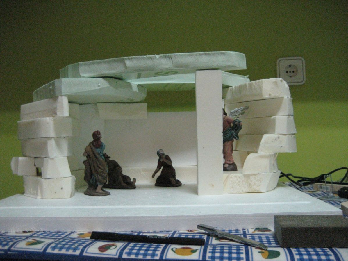 En cuanto a la cueva, yo quizás la oscurecería un poco, también con nogalina clarita, incluso le daría ocres y la gama de los tierras antes de la nogalina.