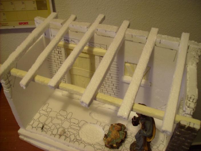 Segundo diseña las tres paredes ,derecha izquierda y fondo ,en el fondo le haces una puerta falsa ,cerrada en los laterales unos ventanales y el techo como te han comentado coje unos troncos colocas en el tejado y les intercalas paja ,si no quieres hacer otro tipo de tejado .