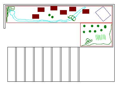 yo lo pondria mas o menos como en el boceto que te adjunto. es decir unos tableros de base montados sobre unos caballetes (en rojo) y el belen en el centro (azul). en el lado mas corto en el dibujo pondria el huerto arboles la fuente, enfin, el campo y en el lado largo pondria el pueblo. para rematar en el lado izquierdo podria ir una cascada con el rio