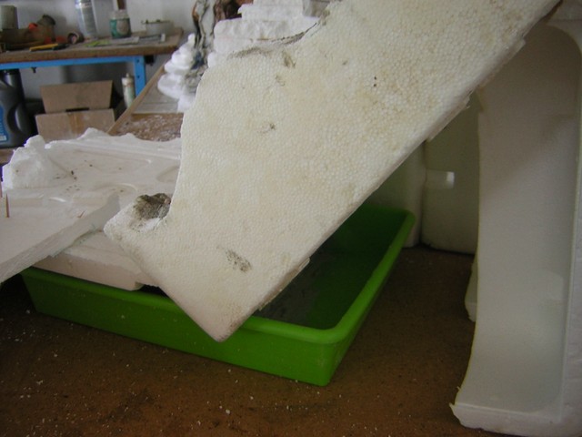 La cascada la he hecho con una caja de porexpan, y rellena de cemento, dándole le forma. Como veis en la foto 5 y 6 el agua se recoge en una bandeja, y encima he colocado una plancha de porex, que ahora la tengo que cortar por donde he señalado para darle la forma.