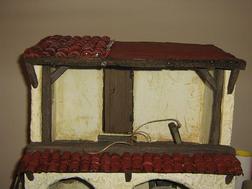 Las tejas las hago con el pórex, cortadas una a una porque me dijeron que con la máquina de cortar fiambre,pero la hoja de mi cortador es ondulada y se me quedaban muy feas,las tuerzo con el rabo del pincel y luego las voy pintando en color terracota, para terminarlas como el color es algo chillón les doy una mano de nogalina por encima para que se queden más oscuras.Cuando las vayas pegando haz lo que hago yo, pues unas se quedan más levantadas de los lados que otras, yo cuando las tengo pegadas(las de abajo)recorto los picos un poco para que no se queden las de arriba mal colocadas o torcidas (porque no me pegaban con la cola)vamos, es un consejo,yo ahora las recorto casi que todas jajajaja.Tardo mucho más, pero me quedan mas iguales.Gracias por contestarme a todo lo que te he preguntado, pero ven mejor cuatro ojos que dos.