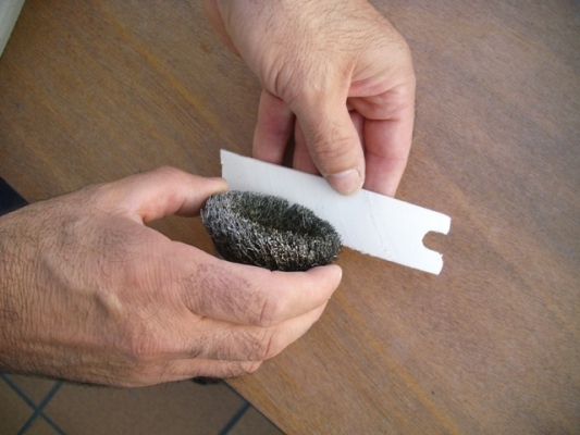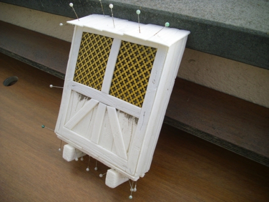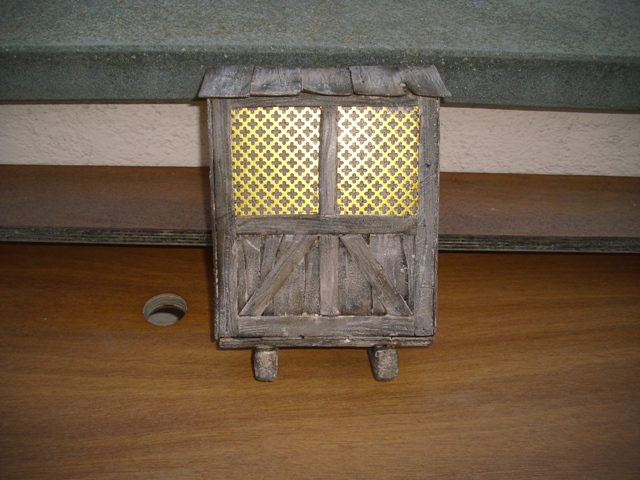 El material que utilizo es porex del duro, un trozo de malla para simular las rejas, cola blanca de carpintero y nogalina para la pintura. Cortamos el porex a la medida que queramos el balcón y le hacemos una cara un poco de pendiente para simular el tejado, pasamos papel de lija por la parte delantera del balcón, para que coja bien la pintura, en la parte baja del balcón, marcamos unas betas con el cuter y luego le pasamos el cepillo de púas. Pintamos la parte de arriba del balcón para poder poner las rejas. Cortamos laminas finas de porex, (yo las corto con la maquina de cortar fiambre) le pasamos papel de lija y después le marcamos las vetas con el cepillo de púas. A continuación cortamos tiras según el grosor que la quedamos dar al marco de las ventanas del balcón haciendo unas un poco más anchas para el tejado y la parte baja del balcón. Después las vamos pegando dando la forma de las ventanas, los laterales y el tejado. Para terminar colocaremos dos travesaños debajo del balcón, y colocaremos también dos vigas que nos aguantaran el balcón. Un par de capas de nogalina y una vez seca unas pinceladas de pintura blanca para darle un toque mas antiguo (pincel seco).
