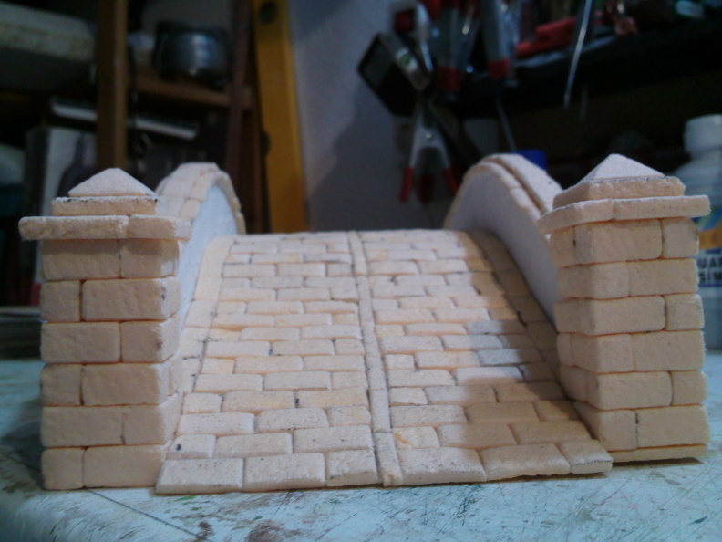 Para hacer esta calzada, primero hice los bordes con adoquines al hilo del puente de las medidas antes mencionadas.