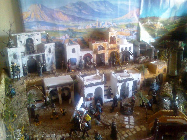 Tienes un gran trabajo, bién realizado. Yo procuraría quitarle parte del aspecto de escaparate, todas las casas tienen la misma orientación y el pueblo está organizado en bancales. Generalmente, los bancales se usan en la agricultura de las zonas montañosas, pero los pueblos son algo más anárquico. Una casa aquí, otra más allá. Cada una según la ladera, aprovechando al máximo los desniveles. Fíjate en las fotos del apartado Nuestros monumentos y, para el año próximo, huye de la "vitrina" de trofeos