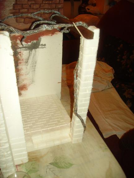 Con respecto a tu pregunta, lo que hecho con la cueva es que a la entrada le he pasado la dremel con un cepillo metálico para rebajarle un poco y que así tuviera más rugosidades, y ya después le empecé a dar la pintura: primero negro, y después mezclando tonos de marrón hasta conseguir el tono deseado. Le puedes dar con cualquier tipo de pintura, pero procura que no sean pinturas al disolvente, pues se comerían la espuma. Yo estoy empleando pinturas al agua y al aguarrás.