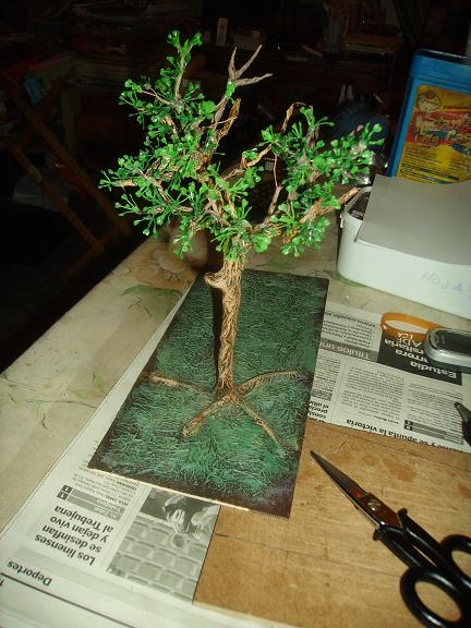 También he empezado ya con las plantas. Habeis visto ya la parra que irá sobre la pérgola de la entrada a la posada, y aqui os dejo uno de los árboles que estoy haciendo con las ramas que rescaté de la basura al podar mi jardín. Le he pegado con silicona algunos trozos de plantas de acuario. Espero que me deis vuestra opinión al respecto. Para ser la primera vez que hago una de este tipo, creo no está mal, aunque seguro que podría estar muchisimo mejor.