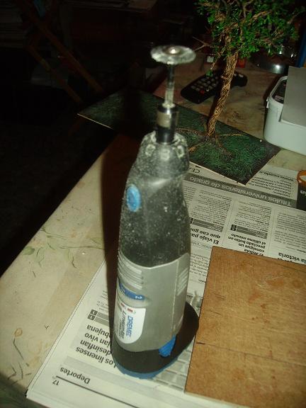 Por otro lado, también pongo una foto de la dremel con el accesorio que he utilizado para darle la textura a las paredes del establo.
