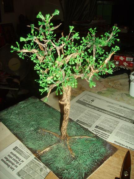 También he empezado ya con las plantas. Habeis visto ya la parra que irá sobre la pérgola de la entrada a la posada, y aqui os dejo uno de los árboles que estoy haciendo con las ramas que rescaté de la basura al podar mi jardín. Le he pegado con silicona algunos trozos de plantas de acuario. Espero que me deis vuestra opinión al respecto. Para ser la primera vez que hago una de este tipo, creo no está mal, aunque seguro que podría estar muchisimo mejor.