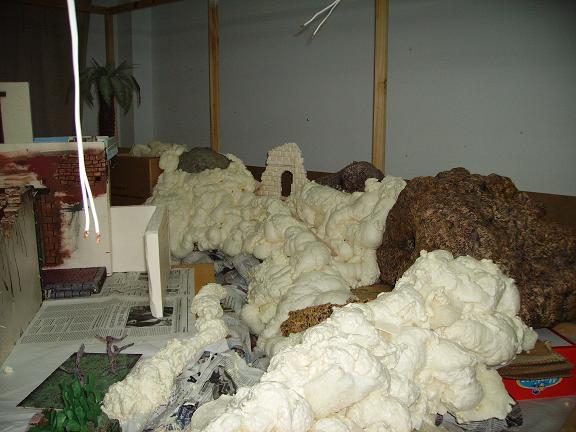 150 montaaÃas y techo establo.JPG (62KB - 241 descargas)Mylgorn, en relación a los tableritos del establo yo los dejaría (ponerle un toldo a la construcción actual puede que no quede bien por ser muy baja la estructura); aunque lo que sí le haria sería dejar menos uniformes los tablones, es decir: envejecerlos. Para ello pondría tablones rotos, no cubriría todos los huecos del techado y algunos los pondría no perpendiculares a la viga; además de la sugerencia que te han dado respecto a la paja.