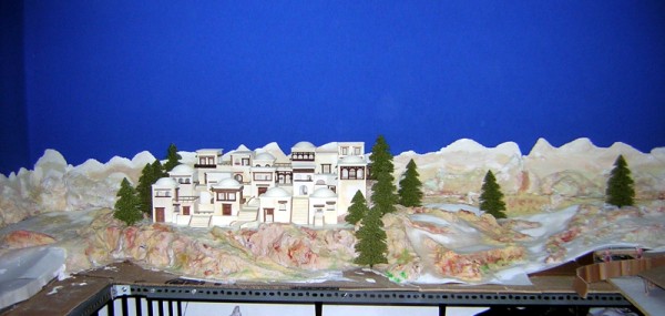 - Para las montañas del fondo la misma tecnica, solo que la parte de atras son laminas de porexpan recortado y los tonos son más claros.