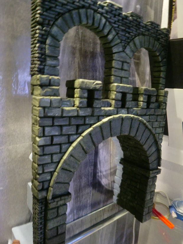 -Para terminar y, como aplique con pasta de modelar una especie de ``enfoscado basto´´ entre piedras. Para dar un efecto de paso del tiempo y no se viera ese enfoscado tan blanco, utilizo un poquito de agua de enjuagar los pinceles a la cual añado un poco de cafe molido ( a falta de envejecedor jeje), y lo aplico directamente sobre toda la superficie, incluyendo piedras.