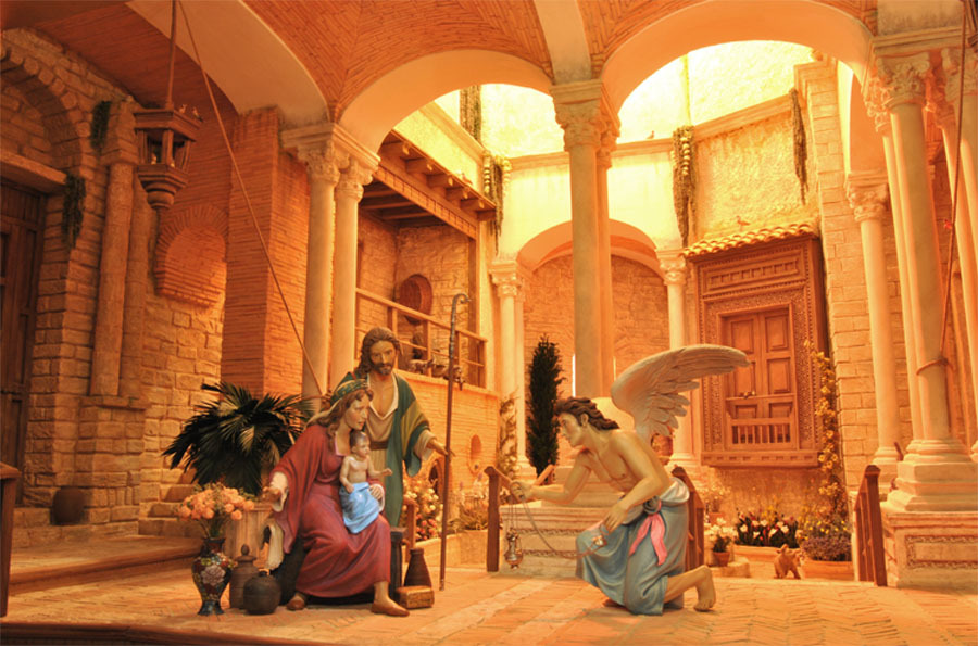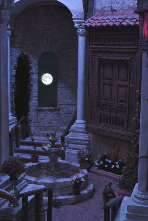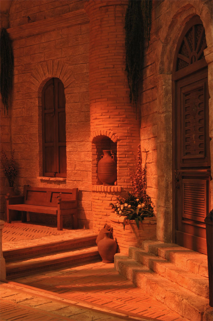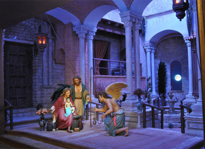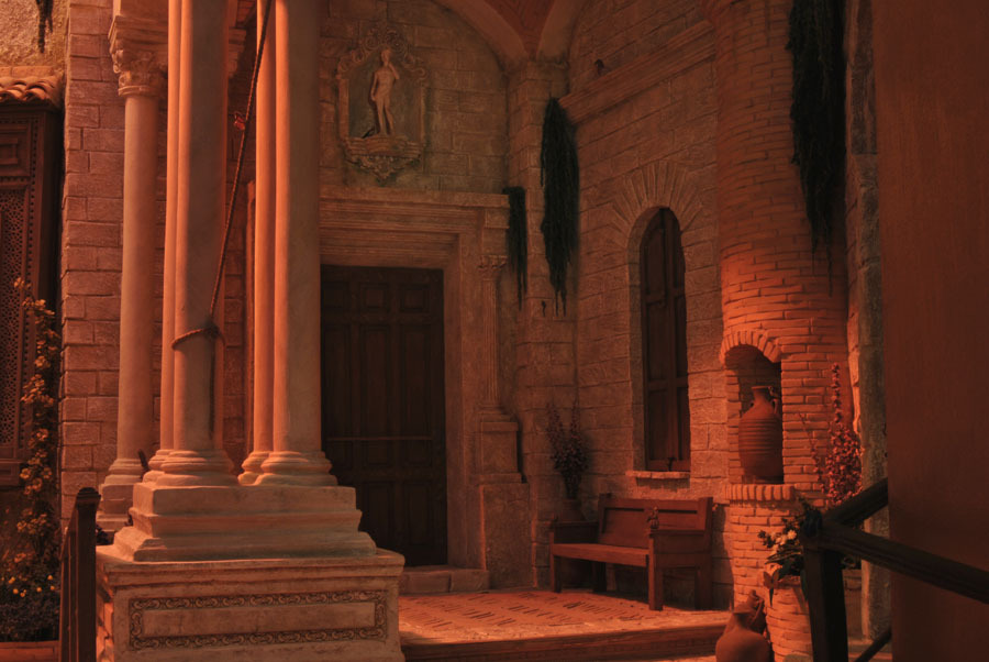 Sobre el Nacimiento, pues tiene una pared a la izquierda que me entusiasmó y unos corredores del patio majestuosos ... unas dimensiones apropiadas para las figuras (muchos belenistas cometen fallos de proporciones; Rafael y María no). Si te agachas un poco, puedes empaparte de la monumentalidad de la construcción ... El reflejo del atardecer en las columnas crean una danza de líneas verticales preciosa. El color y textura de cada piedra, ladrillo ... muy conseguido.