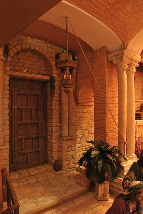 Sobre el Nacimiento, pues tiene una pared a la izquierda que me entusiasmó y unos corredores del patio majestuosos ... unas dimensiones apropiadas para las figuras (muchos belenistas cometen fallos de proporciones; Rafael y María no). Si te agachas un poco, puedes empaparte de la monumentalidad de la construcción ... El reflejo del atardecer en las columnas crean una danza de líneas verticales preciosa. El color y textura de cada piedra, ladrillo ... muy conseguido.