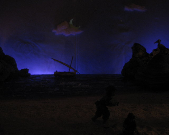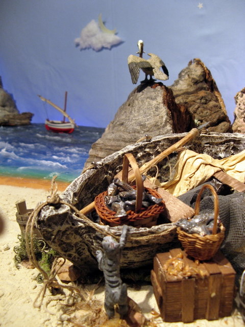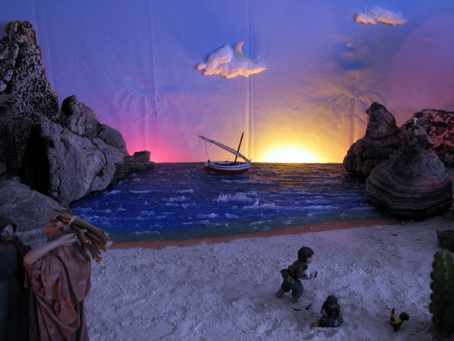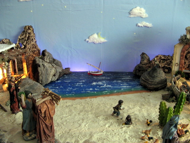 Este año esta inspirado en un ambiente de pescadores, y así he colocado mi portal al lado de una playa con el mar al fondo.