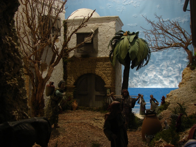 Hola, muchas gracias a todos por vuestros comentarios que sin duda son muy estimulantes. En cuanto a las medidas el belén tiene 2,5m x 2,5m y las figuras son de 19 cm las de primer plano y de 12 las del segundo. El fondo es tan sencillo como una tela azul clara con nubes de guata y un juego de luces. Par el mar he utilizado la técnica de la silicona. Os dejo algunas fotos más.