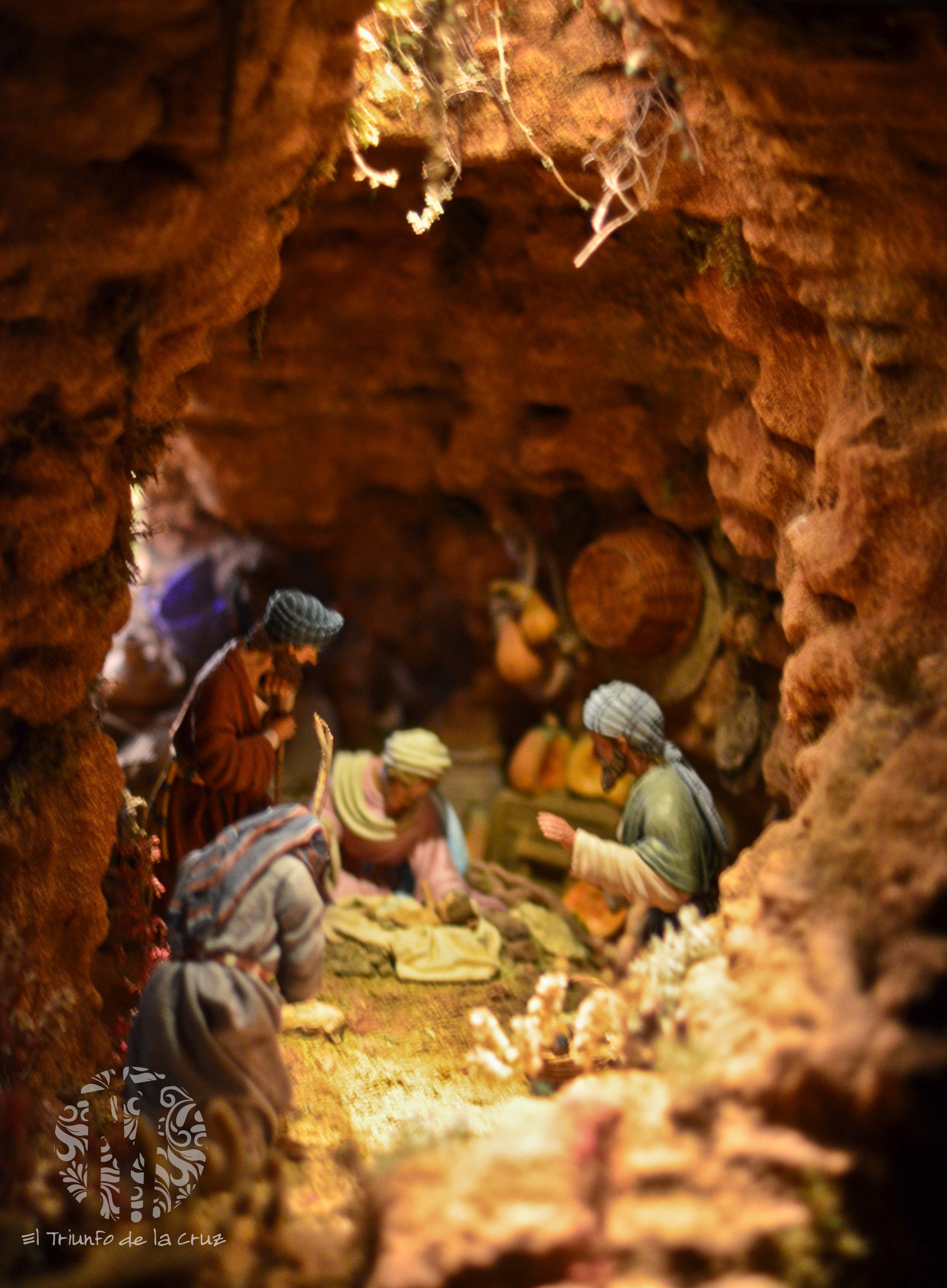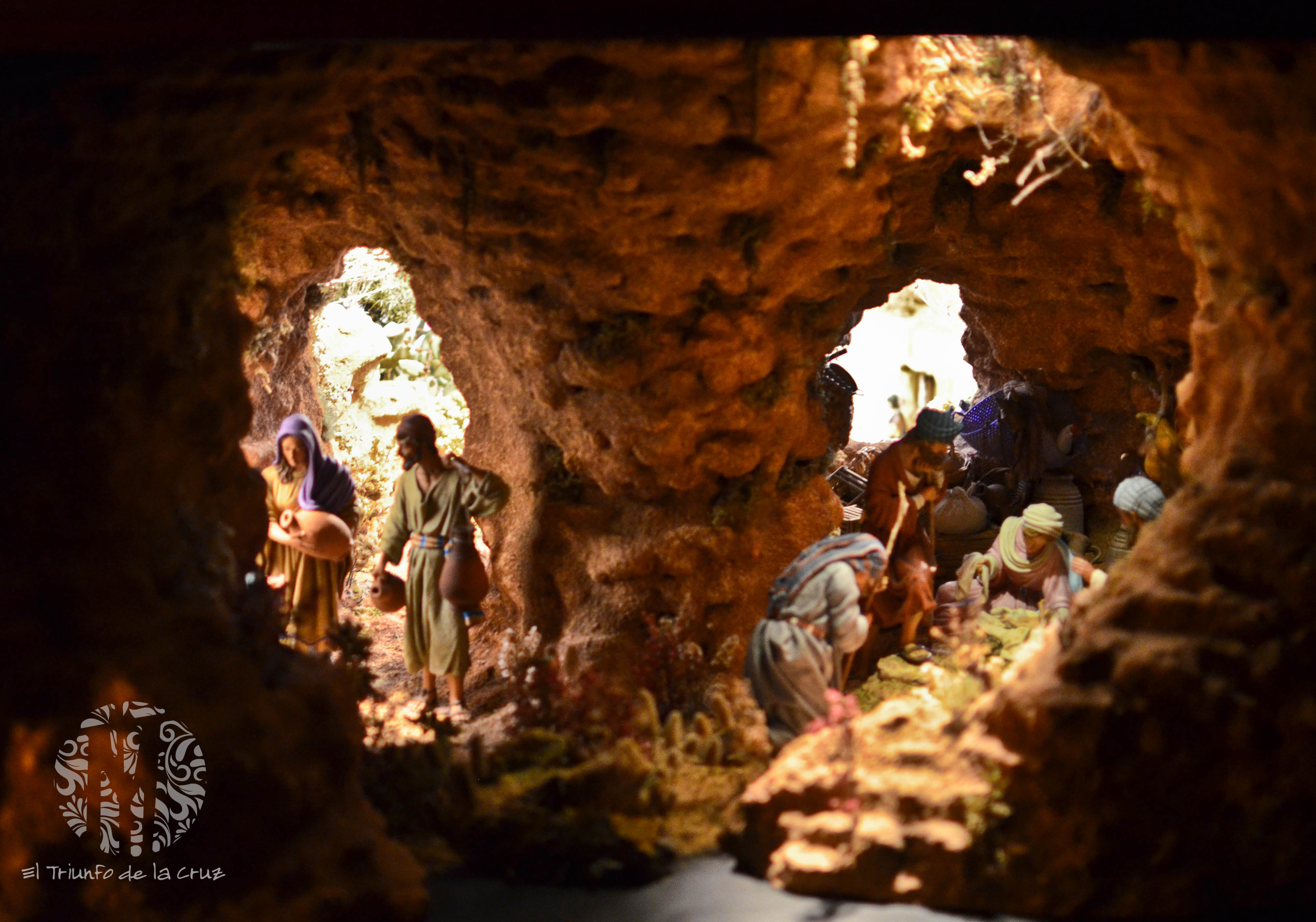 La profundidad al belén se la aportan dos aperturas en la parte trasera de la cueva que dejan entrever unas construcciones con figuras en la lejanía y un jardín salvaje en un plano más cercano.
