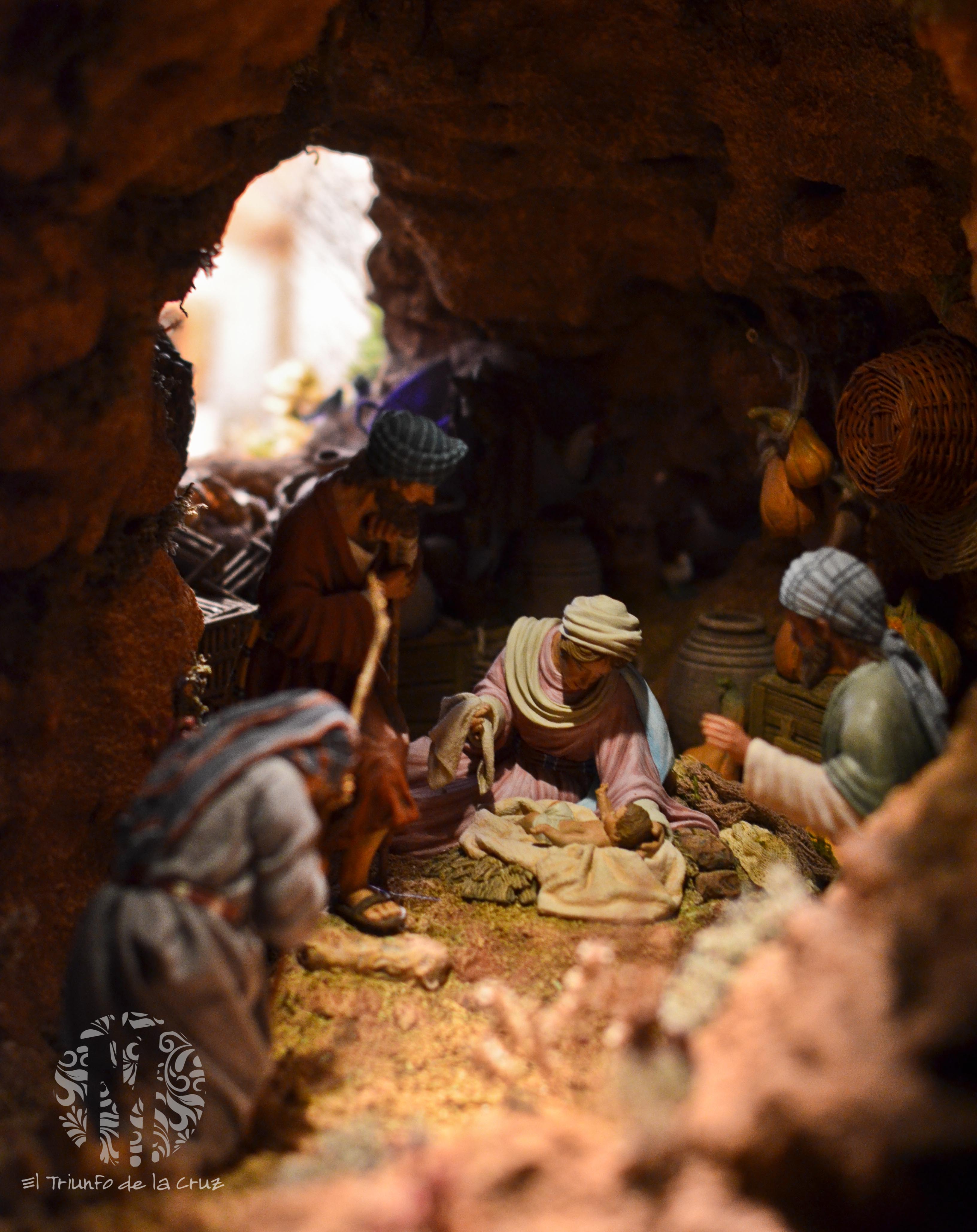 En esta ocasión la escenografía se centra en la recreación del nacimiento de Jesús en el interior de una cueva. Ésta se encuentra fraccionada en dos grandes mitades divididas por un pilar central que aporta simetría a la composición.