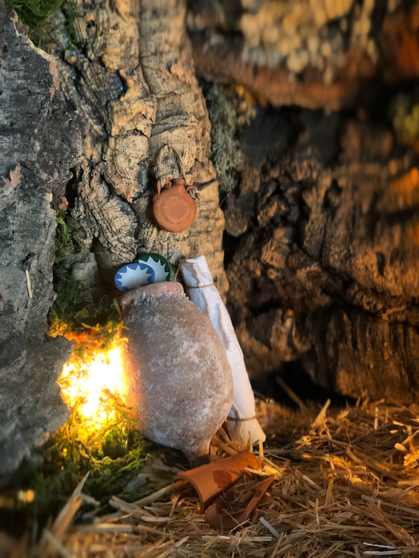 Ha sido un reto recrear en el salón de casa una gruta, resolver un espacio relativamente pequeño para figuras de 21 cm, con un espejo de fondo que invita al espectador que lo contempla a formar parte de la composición.