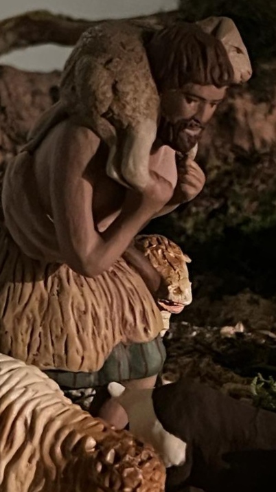 Belén exprés de este año: Se trata del montaje ante la vidriera, ubicación que se ha ido haciendo habitual en las últimas navidades, aunque en un ángulo he utilizado un pequeño fondo. El pesebre se compone de dos escenas separadas por un gran olivo entre cuyas ramas se ve una paloma blanca. He querido incluir el significado simbólico de estos elementos en un momento de tantos conflictos en el mundo. El nacimiento también constituye una plegaria al Dios que se hace uno de nosotros. Y en esta ocasión es una petición por la paz. La parte de la derecha narra el episodio de la búsqueda de posada. Aparece el grupo de Castells de 11 cm y, en primer plano, un niño de Mayo jugando con un pajarillo frente a una noria. En la zona izquierda aparece el portal con el nacimiento complicado de Castells de 11 cm y unos pastores que se acercan a adorar (Castells y Gemma Bertrán). En el primer plano hay figuras de camino de Joaquín Pérez. Os deseo a todos una feliz Navidad.