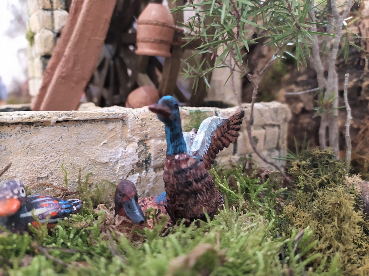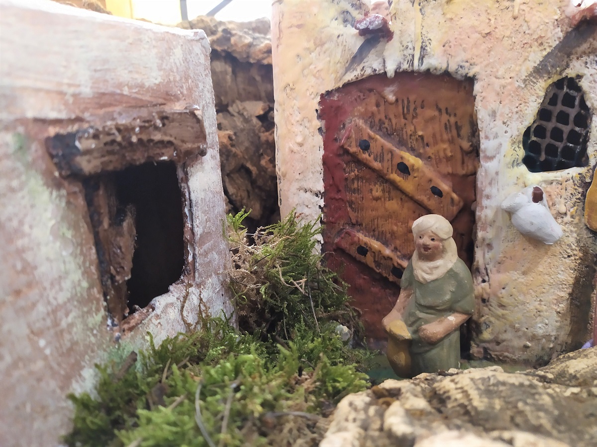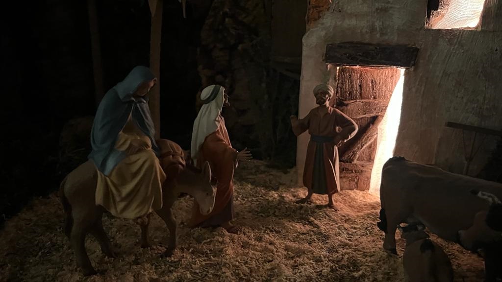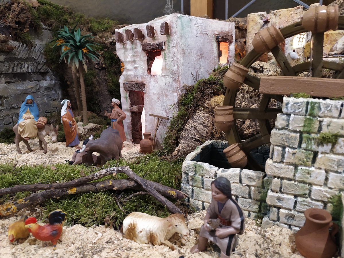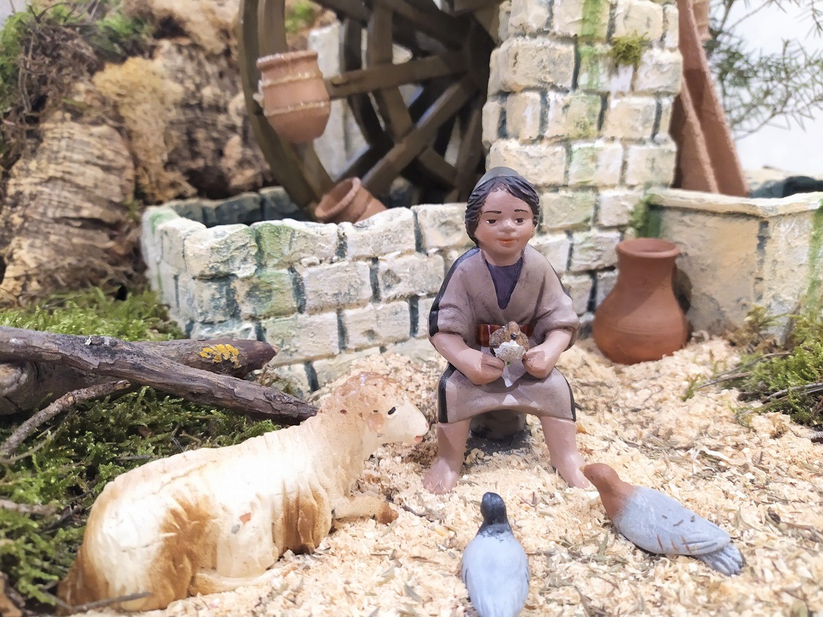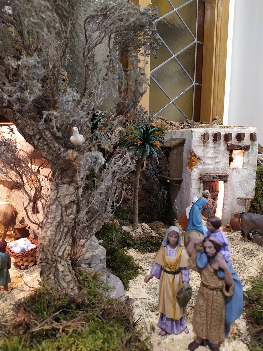 Belén exprés de este año: Se trata del montaje ante la vidriera, ubicación que se ha ido haciendo habitual en las últimas navidades, aunque en un ángulo he utilizado un pequeño fondo. El pesebre se compone de dos escenas separadas por un gran olivo entre cuyas ramas se ve una paloma blanca. He querido incluir el significado simbólico de estos elementos en un momento de tantos conflictos en el mundo. El nacimiento también constituye una plegaria al Dios que se hace uno de nosotros. Y en esta ocasión es una petición por la paz. La parte de la derecha narra el episodio de la búsqueda de posada. Aparece el grupo de Castells de 11 cm y, en primer plano, un niño de Mayo jugando con un pajarillo frente a una noria. En la zona izquierda aparece el portal con el nacimiento complicado de Castells de 11 cm y unos pastores que se acercan a adorar (Castells y Gemma Bertrán). En el primer plano hay figuras de camino de Joaquín Pérez. Os deseo a todos una feliz Navidad.