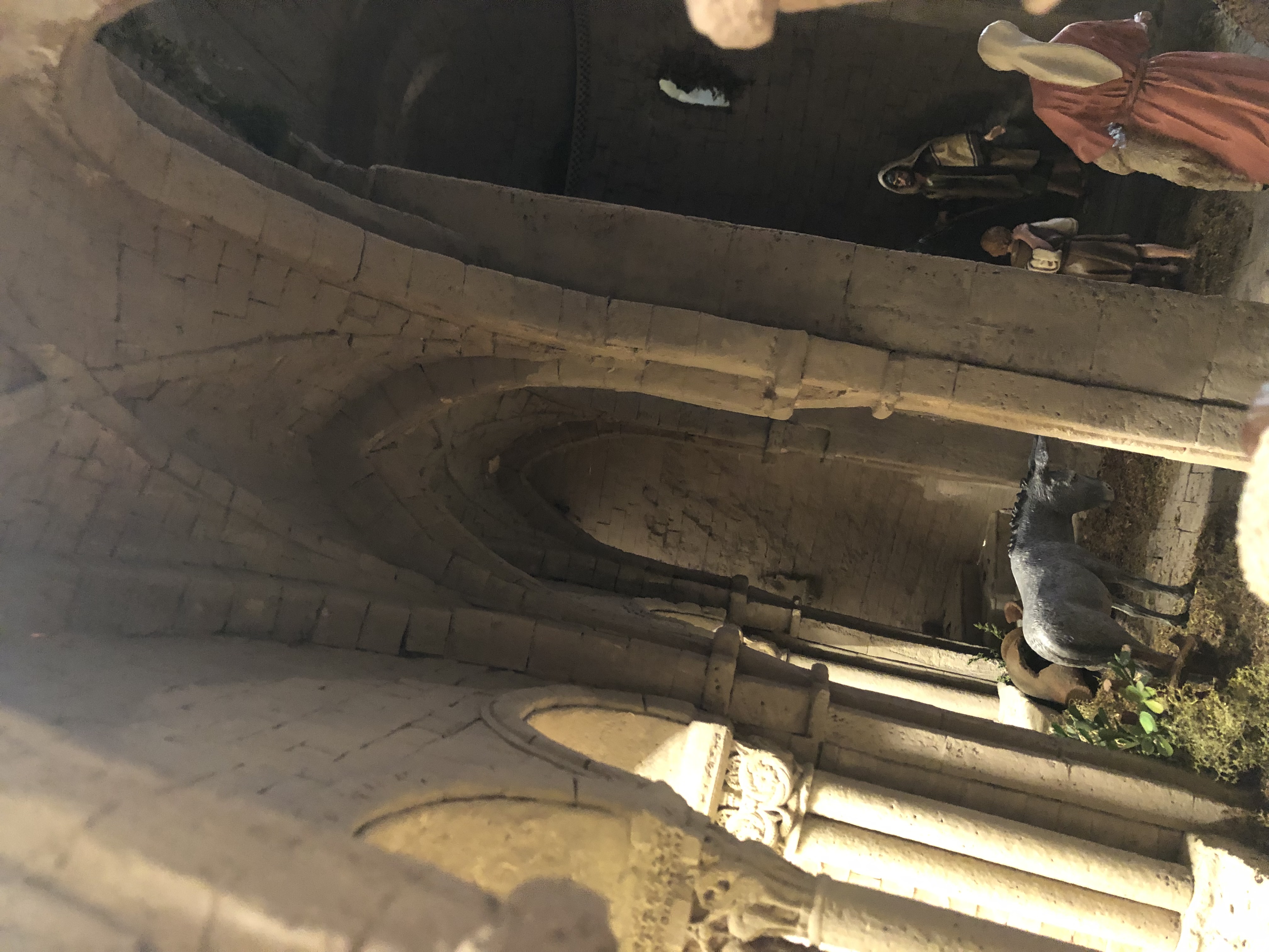 El belén se ve arquitectónicamente muy interesante, con mucho trabajo (¿los muros y bóvedas están hechos piedra a piedra?). La atmósfera que captan las fotos también es muy llamativa, ¿es un efecto fotográfico, o también se aprecia en vivo? ¿Es algún tipo de efecto niebla?