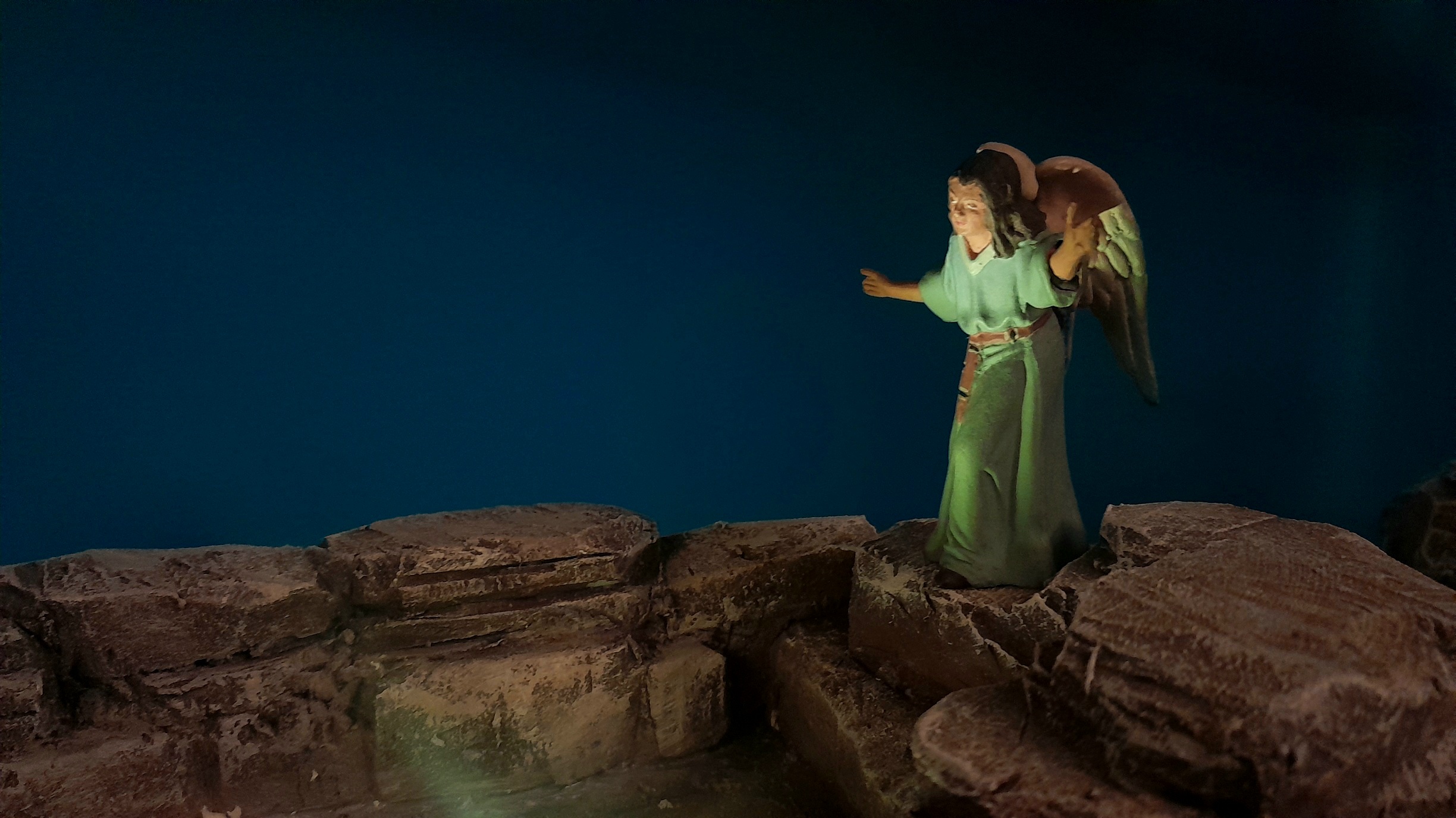 En realidad, será prácticamente el mismo del año pasado, pequeño y sencillo, pero con algunas mejoras (celaje, iluminación...), y una escena nueva, la anunciata. Justamente el ángel anunciador ya se encuentra en la zona, probando las luces y supervisando el terreno, y avisándonos de que viene algo muy grande: