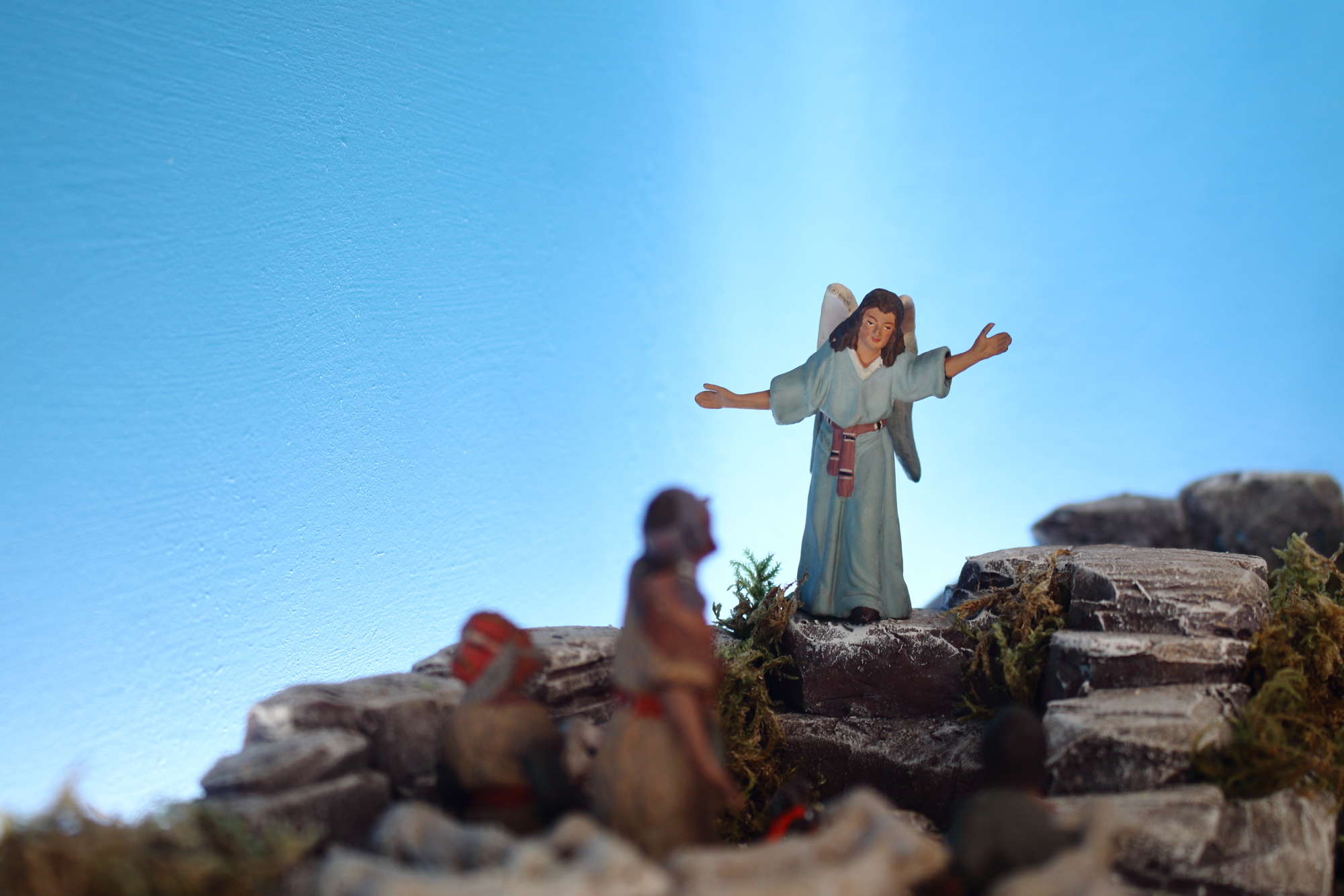 En realidad, será prácticamente el mismo del año pasado, pequeño y sencillo, pero con algunas mejoras (celaje, iluminación...), y una escena nueva, la anunciata. Justamente el ángel anunciador ya se encuentra en la zona, probando las luces y supervisando el terreno, y avisándonos de que viene algo muy grande: