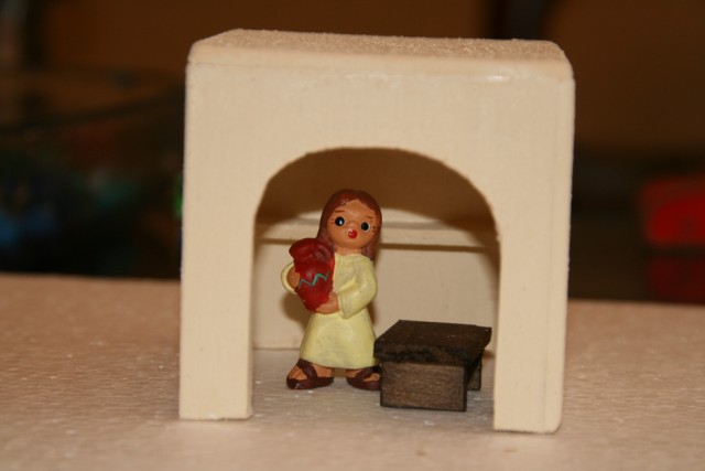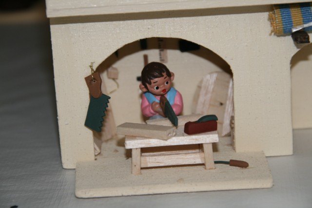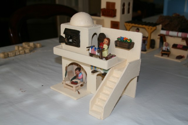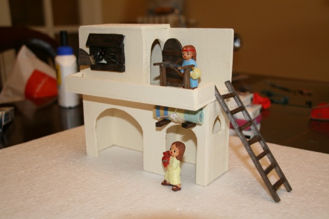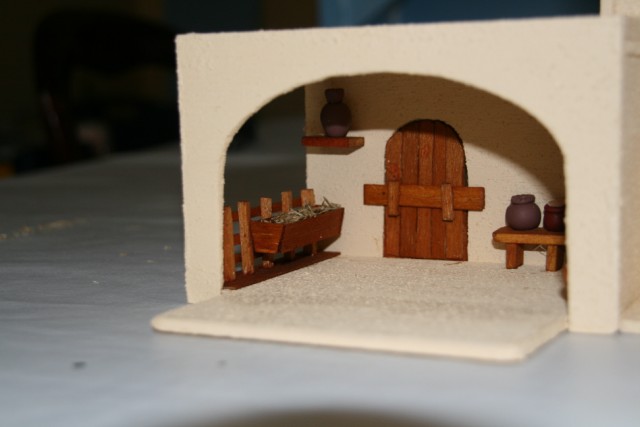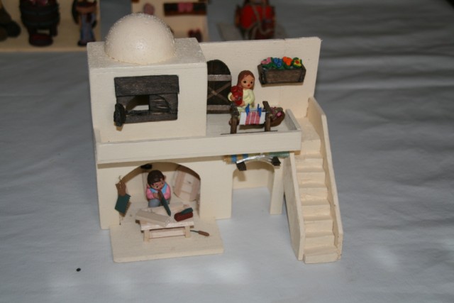 Me preguntas sobre las medidas de la "casa del escribano" y la verdad es que ahora mismo no las sé. Lo tengo todo bien embaladito y guardado esperando el mes de noviembre en que empiece con el montaje de este año. Ninguna de las casas que construyo tienen las mismas medidas, depende del diseño de cada una, del espacio en el que van a ir colocadas y las escenas que vamos a componer en ellas (teniendo en cuenta que en la llamada "colección de 4cm" no todas las figuras tienen la medida exacta, oscilan entre los 4'5cm y los 6). Pero para que te hagas una idea de las proporciones, las puertas tienen una altura d 6cm, a partir de ahí es dar a la construcción la altura adecuada para que todo se vea bien proporcionado.