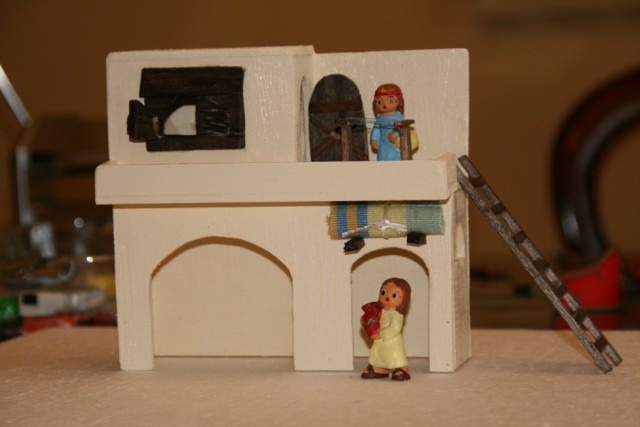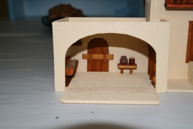 Me preguntas sobre las medidas de la "casa del escribano" y la verdad es que ahora mismo no las sé. Lo tengo todo bien embaladito y guardado esperando el mes de noviembre en que empiece con el montaje de este año. Ninguna de las casas que construyo tienen las mismas medidas, depende del diseño de cada una, del espacio en el que van a ir colocadas y las escenas que vamos a componer en ellas (teniendo en cuenta que en la llamada "colección de 4cm" no todas las figuras tienen la medida exacta, oscilan entre los 4'5cm y los 6). Pero para que te hagas una idea de las proporciones, las puertas tienen una altura d 6cm, a partir de ahí es dar a la construcción la altura adecuada para que todo se vea bien proporcionado.